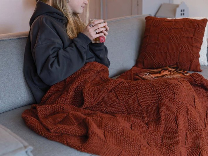 This knitted throw blanket with matching cushion, made with Durable Dare, is the must-have for a stylish and comfortable home. The modern look, the textured pattern, and the ultra-soft feel make this set irresistible for anyone who loves warmth and atmosphere in their living space.