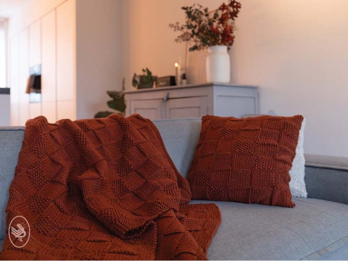 Deze gebreide woondeken met bijpassend kussen, gemaakt met Durable Dare, is dé must-have voor een stijlvol en comfortabel thuis. De moderne uitstraling, de structuur en de superzachte feel maken deze set onweerstaanbaar voor iedereen die houdt van warmte en sfeer in huis. De voorbeelden zijn gemaakt in de prachtige kleur Brick 2239.