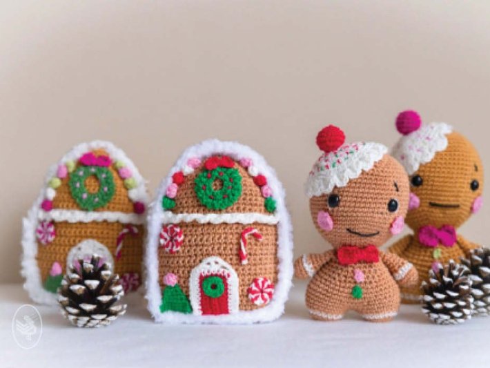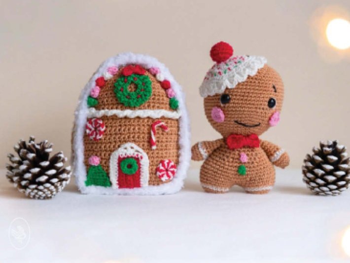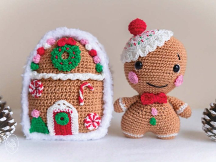 Comme c’est chaleureux ! Une adorable petite maison en pain d’épices crochetée, entièrement décorée de « glaçage » et de joyeux bonbons. Bien sûr, le petit bonhomme en pain d’épices ne peut pas manquer.