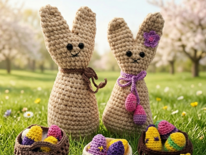 Deux adorables petits lapins de Pâques, réalisés avec le fil Durable Velvet pour la table de Pâques. Les détails sont finis avec Durable Coral. Un duo joyeux, parfait comme décoration de Pâques ou comme cadeau fait main.