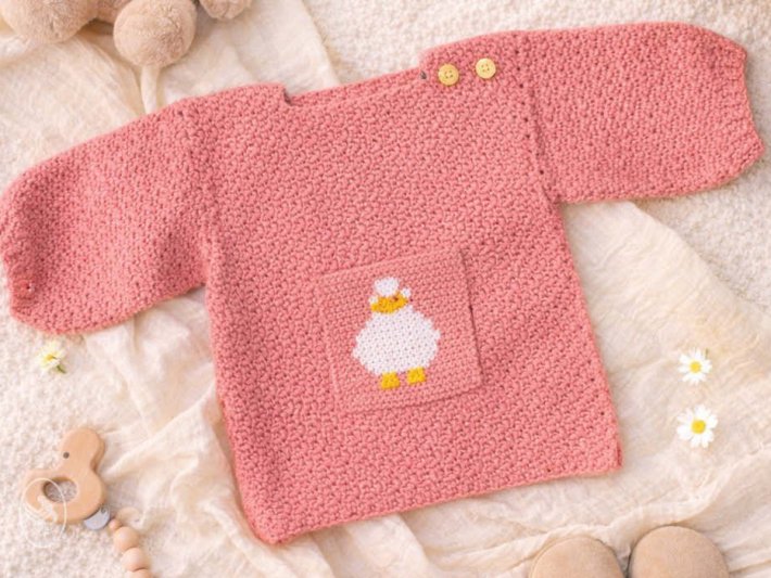 Crochet your own cute baby sweater with a little duck using this pattern. The design is made with Durable Cosy Extra Fine, a soft and comfortable yarn that is perfect for baby clothing.
