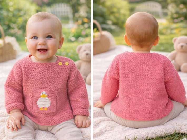 This baby sweater crochet pattern is suitable for both beginners and more advanced crocheters, and is ideal as a baby shower gift or handmade baby item. The crocheted duck adds a playful and unique touch to the sweater.